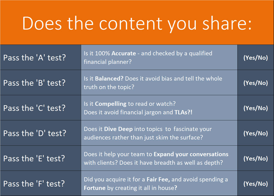 This (10-minute read) is one of three Insights for owners of Financial Planning/Advice firms, covering six tests for rating the services of content creators or suppliers.